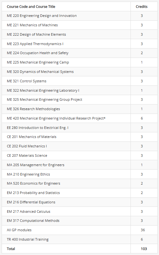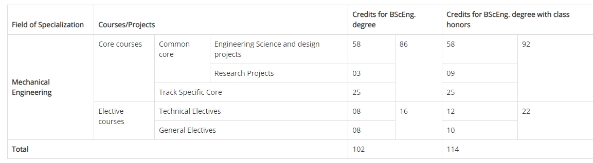 - Mechanical Engineering Common Core : 103 credits (including first year courses and Industrial Training)
