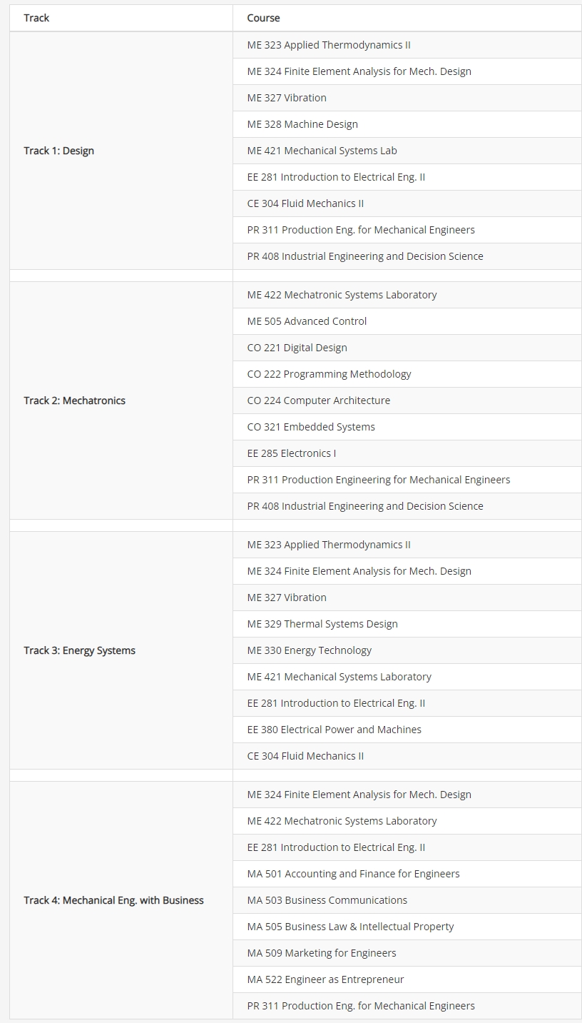 - Four minor specializations (Tracks): Design; Mechatronics; Energy Systems; Mechanical Engineering with Business