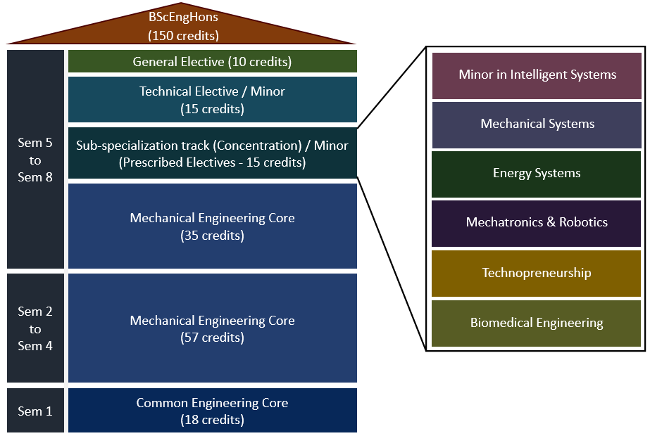 Further to majoring in Mechanical Engineering, the department offers five concentrations (sub-specialization tracks) to provide the students with in-depth investigation into one of the areas related to Mechanical Engineering: Additionally, the students who opt to specialize in Mechanical Engineering could also follow the following minor programme offered by the Faculty of Engineering.