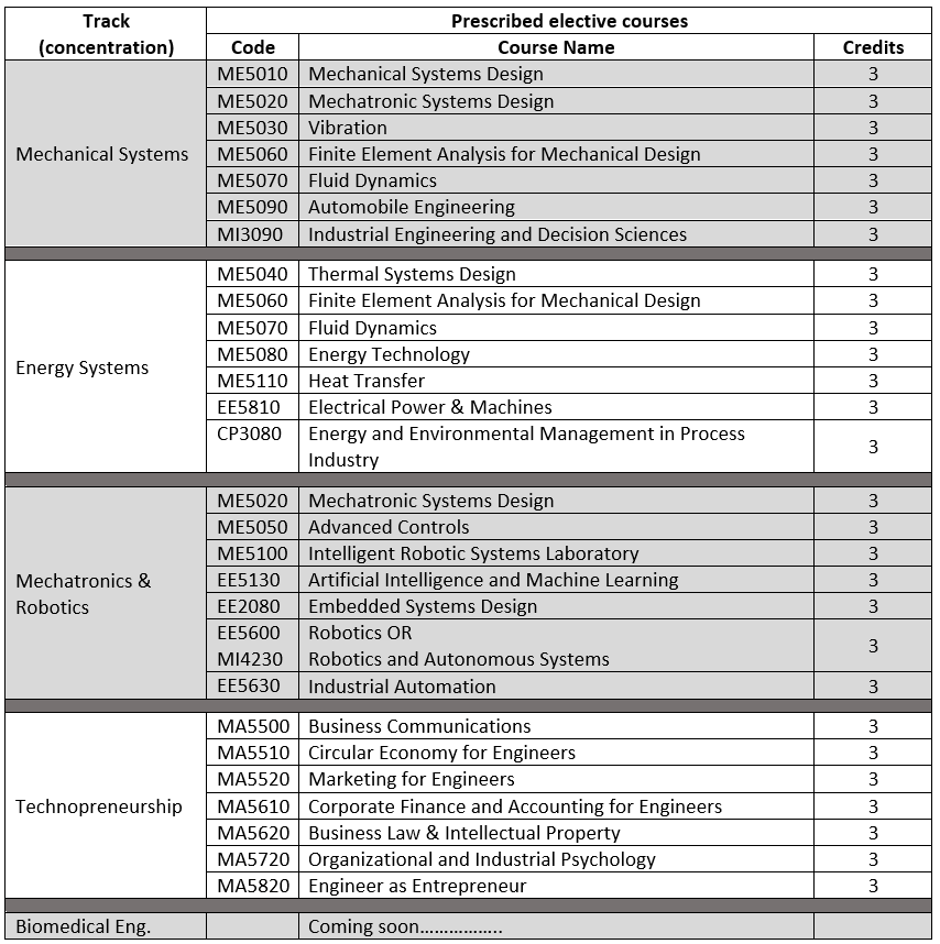 Note: Prescribed Elective courses listed in one track of sub-specialization can be considered as free technical elective courses for other tracks.