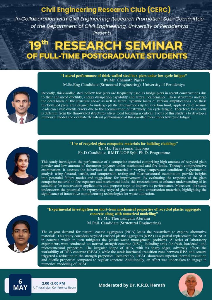 Civil Engineering Research Club (CERC) in Collaboration with Civil Engineering Research Promotion Sub-Committee of the Department of Civil Engineering, University of Peradeniya Presents 19th Research Seminar of Full-Time Research Students on 06th May 2024.