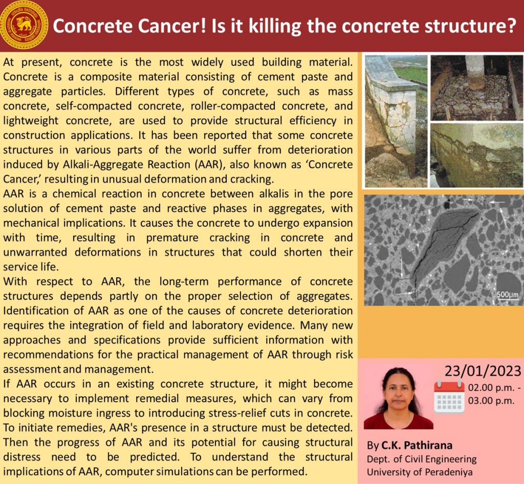 A Research Seminar (ONLINE) on “Concrete Cancer! Is it killing the concrete structure?” by Dr. (Mrs) C.K. Pathirana will be held on 23rd January 2023, from 2.00 p.m. to 3.00 p.m. Categories News, Research Date January 19, 2023 Share: AutherDCE Previous post CES Field visit to Anuradhapura Ancient Structures January 19, 2023 Next post A Research Seminar (ONLINE) on "Story of Ambalm" by Dr. A.G.H.J. Edirisinghe will be held on 27th February 2023, from 2.00 p.m. to 3.00 p.m. February 21, 2023 You may also like Promotion to the post of Professor – Dr. P. B. G. Dissanayake November 7, 2025 Department of Civil Engineering Participates in the Regional Climate Change Conference (RCCC 2025) October 13, 2025 University of Peradeniya Signs MoU with China State Construction Engineering Corporation (Sri Lanka) October 3, 2025