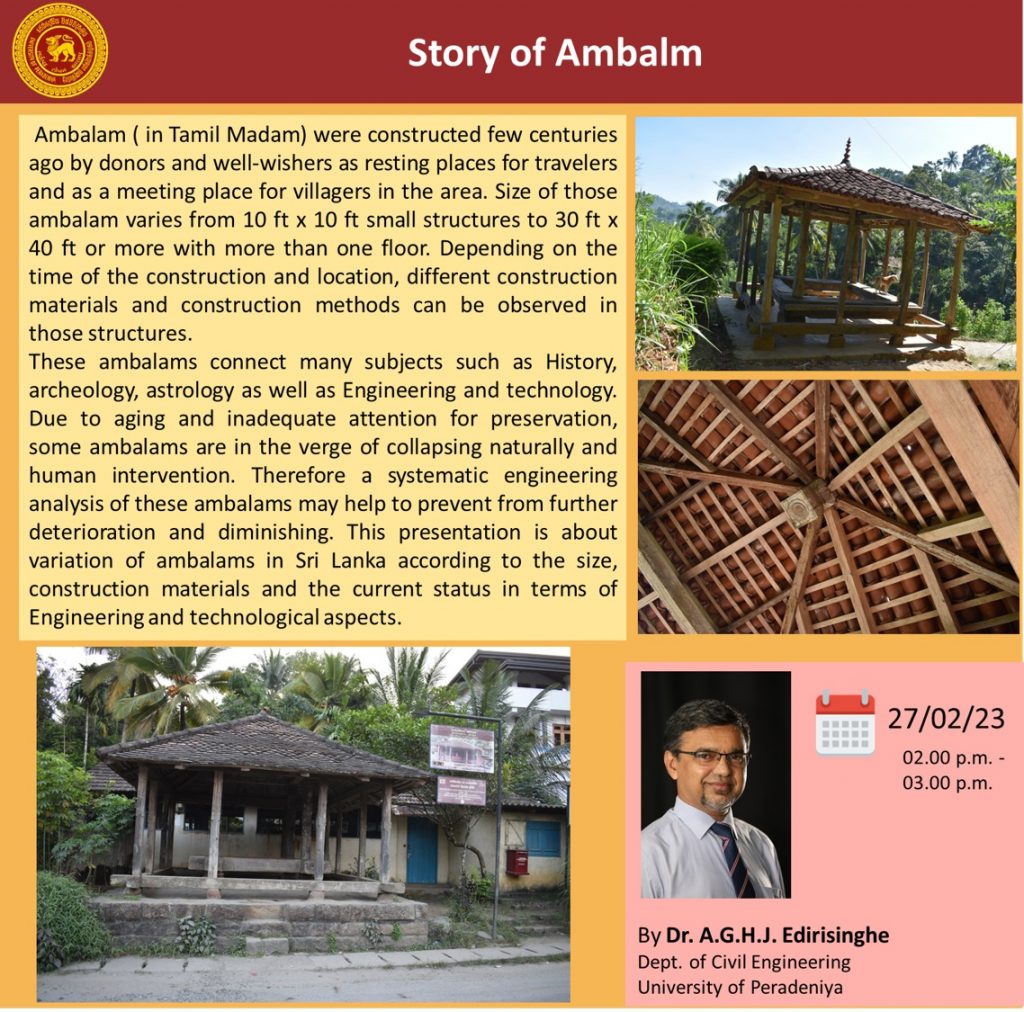 A Research Seminar (ONLINE) on “Story of Ambalm” by Dr. A.G.H.J. Edirisinghe will be held on 27th February 2023, from 2.00 p.m. to 3.00 p.m. Categories News, Research Date February 21, 2023 Share: AutherDCE Previous post A Research Seminar (ONLINE) on "Concrete Cancer! Is it killing the concrete structure?" by Dr. (Mrs) C.K. Pathirana will be held on 23rd January 2023, from 2.00 p.m. to 3.00 p.m. February 21, 2023 Next post Post of Temporary Instructors February 24, 2023 You may also like Promotion to the post of Professor – Dr. P. B. G. Dissanayake November 7, 2025 Department of Civil Engineering Participates in the Regional Climate Change Conference (RCCC 2025) October 13, 2025 University of Peradeniya Signs MoU with China State Construction Engineering Corporation (Sri Lanka) October 3, 2025
