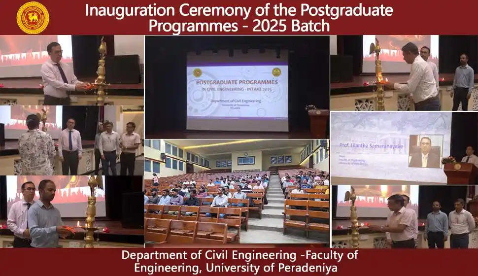 The Department of Civil Engineering, Faculty of Engineering, University of Peradeniya,successfully held the inauguration ceremony for the Postgraduate Programmes -2025 batch on 10 th January 2026 at the E.O.E. Pereira theatre, from 9:00 a.m. to 10.00 a.m.