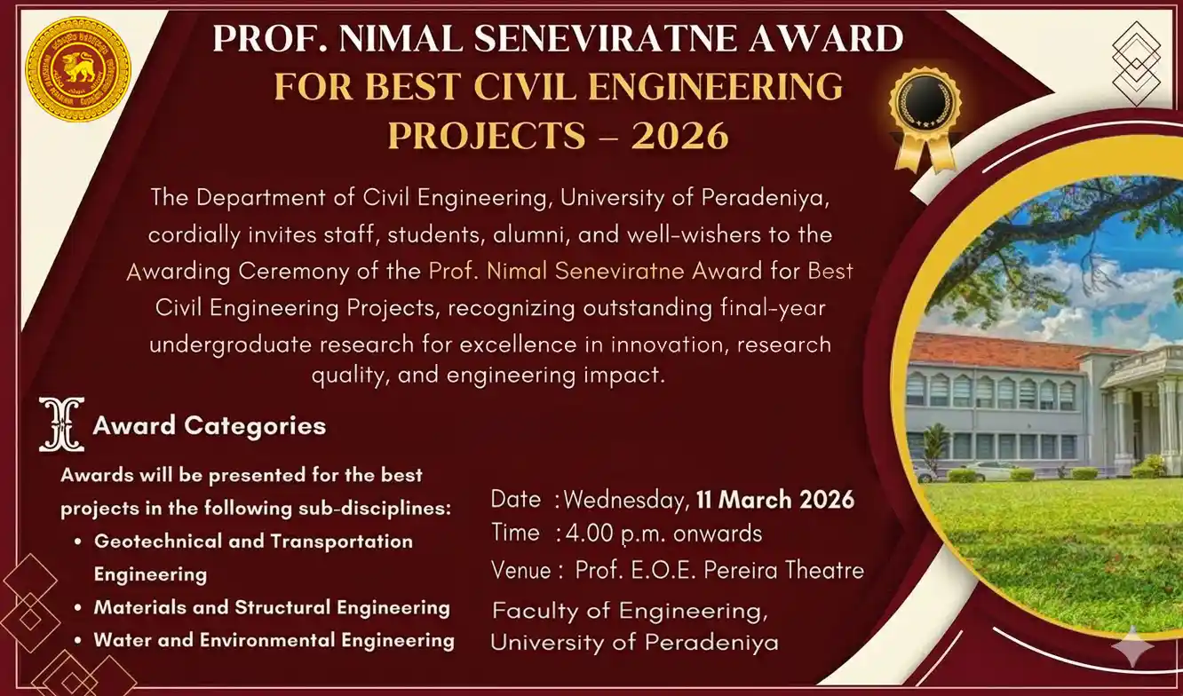 The Department of Civil Engineering, University of Peradeniya, cordially invites staff, students, alumni, and well-wishers to the Awarding Ceremony of the Prof. Nimal Seneviratne Award for Best Civil Engineering Projects. This award recognizes outstanding final year research projects conducted by undergraduate students in the …