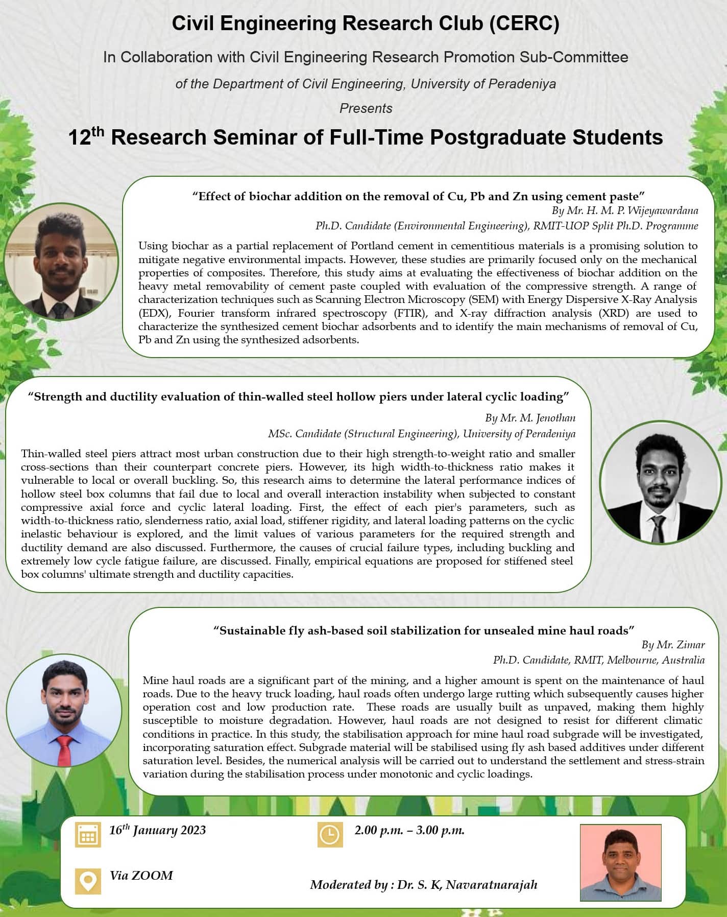 The paper titled “Effective Supplementation of Biochar in Alkali-activated Slag Production” authored by Ms. Harshani Egodagmage (UoP-RMIT PhD student), Dr. Hiran Yapa, Dr. Samith Buddika, Dr. Kate Nguyen (RMIT), Dr. Sathees Kumar Navarathnam (RMIT) won the Professor S.R. De S. Chandrakeerthy Award for the “Best Paper” presented at the …