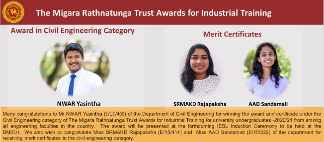 Many congratulations to Mr NWAR Yasintha (E/15/409) of the Department of Civil Engineering for winning the award and certificate under the Civil Engineering category of The Migara Rathnatunga Trust Awards for Industrial Training for university undergraduates -2020/21 from among all …