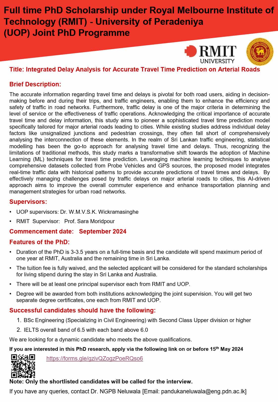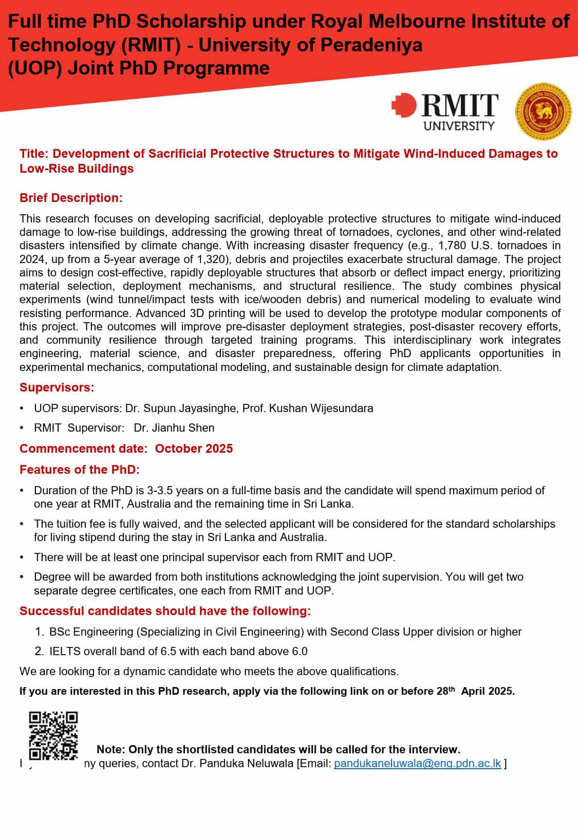 (A collaborative project with the Dalian University of Technology, China) Two MPhil studentships are available at the Department of Civil Engineering, Faculty of Engineering, University of Peradeniya, Sri Lanka. Project title : Precise Identification, Deep Removal Strategies and Environmental Safety Evaluation …
