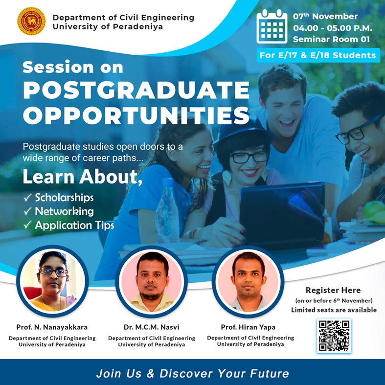 The Department of Civil Engineering, University of Peradeniya is looking for a Management Assistant (contract basis) for the Postgraduate Programmes in Civil Engineering. Advertisement Application form