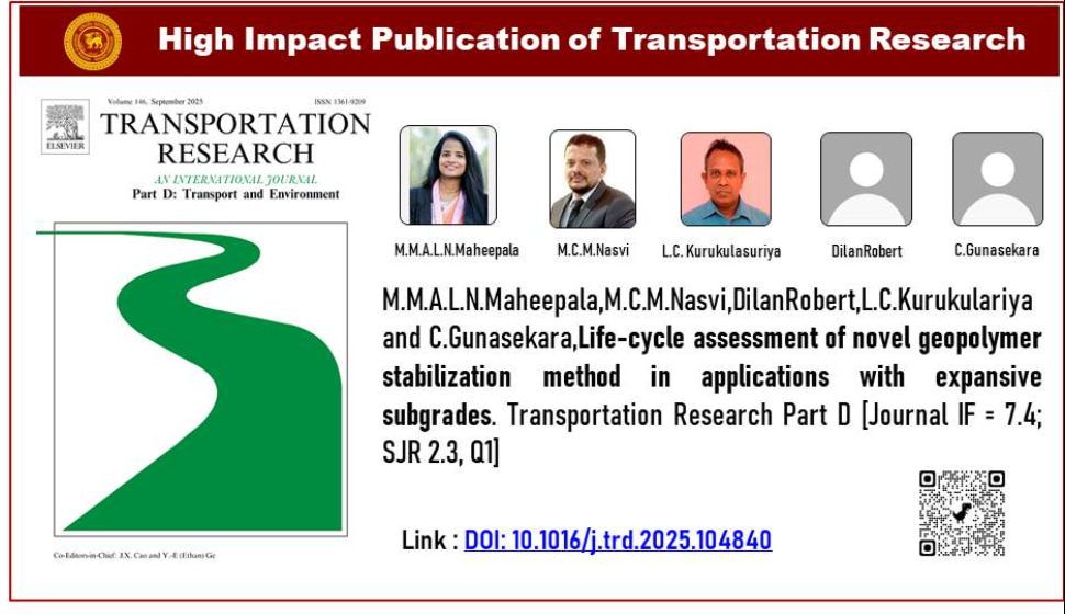 M.M.A.L.N. Maheepala, M.C.M. Nasvi, Dilan Robert, L.C. Kurukulasuriya and C. Gunasekara, Life-cycle assessment of novel geopolymer stabilization method in applications with expansive subgrades. Transportation Research Part D [Journal IF = 7.4; SJR 2.3, Q1]. Link : DOI: 10.1016/j.trd.2025.104840