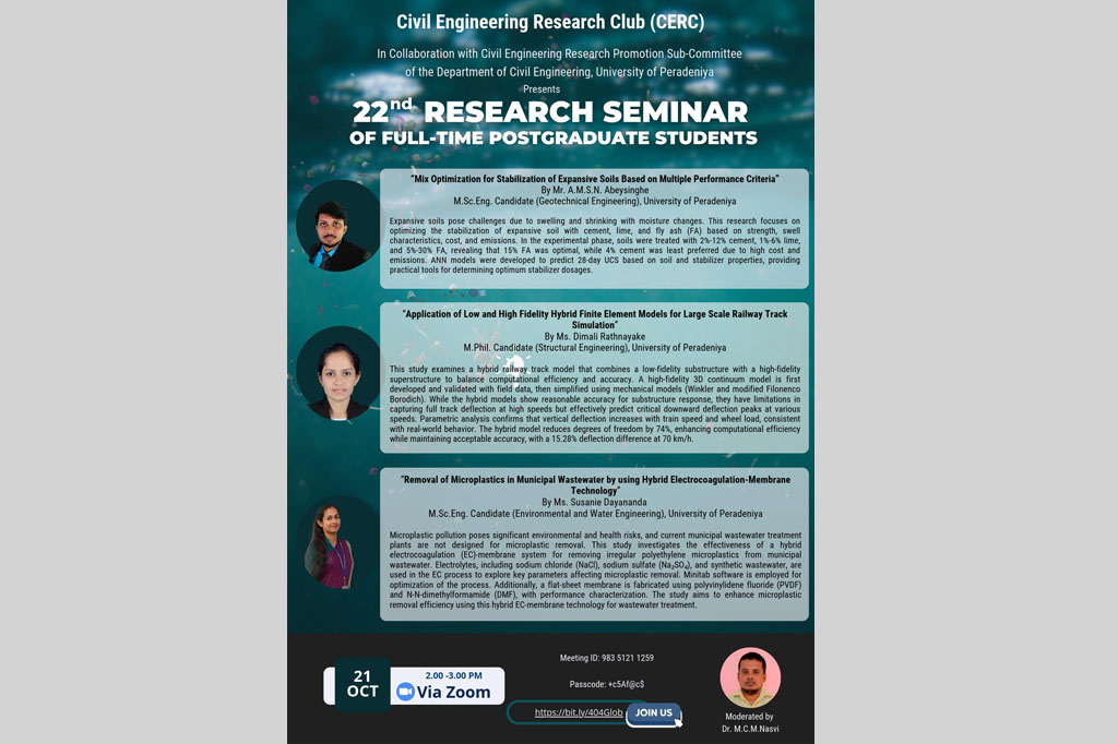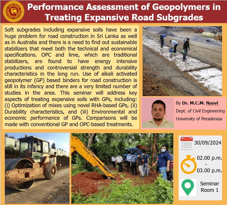 A Research Seminar on “Performance Assessment of Geopolymers in Treating Expansive Road Subgrades” by Dr. M. C. M. Nasvi will be held on 30th September 2024, from 2.00 pm to 3.00 pm.
