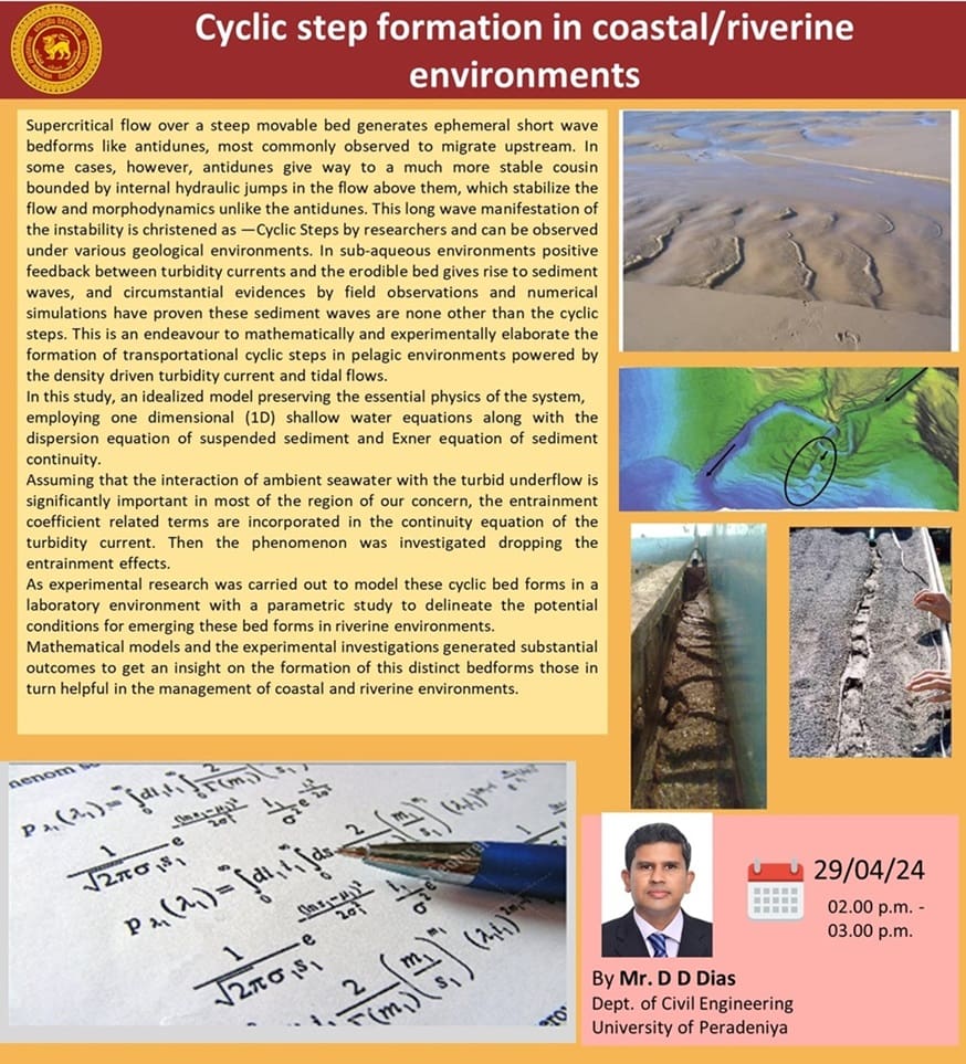 DEPARTMENTAL RESEARCH SEMINAR A Research Seminar (ONLINE) on “Cyclic step formation in coastal/riverine environments” by Mr. D.D. Dias Research promotion subcommittee, Department of Civil Engineering will have their next department research seminar (ONLINE) on 29th April 2024, from 2.00 pm to 3.00 …