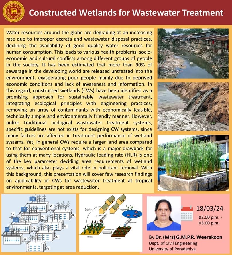 DEPARTMENTAL RESEARCH SEMINAR A Research Seminar (ONLINE) on “Constructed Wetlands for Wastewater Treatment” by Dr. (Mrs) G.M.P.R. Weerakoon Research promotion subcommittee, Department of Civil Engineering will have their next department research seminar (ONLINE) on 18th March 2024, from 2.00 pm to 3.00 …
