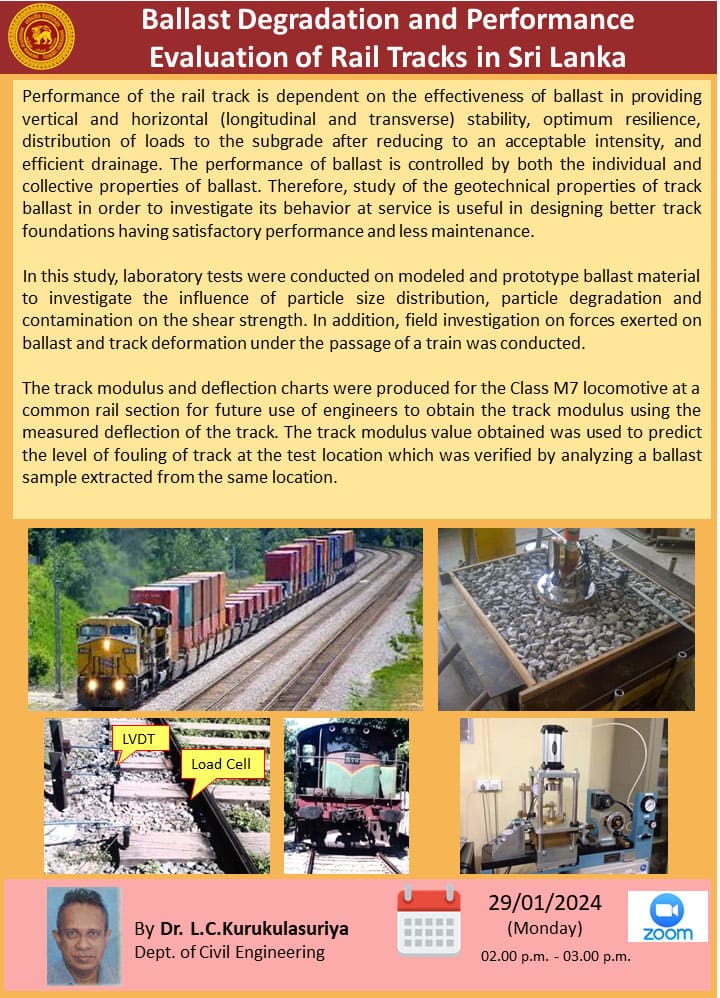 DEPARTMENTAL RESEARCH SEMINAR A Research Seminar (ONLINE) on “Ballast Degradation and Performance Evaluation of Rail Tracks in Sri Lanka” by Dr. L.C. Kurukulasuriya Research promotion subcommittee, Department of Civil Engineering will have their next department research seminar (ONLINE) on 29th January …