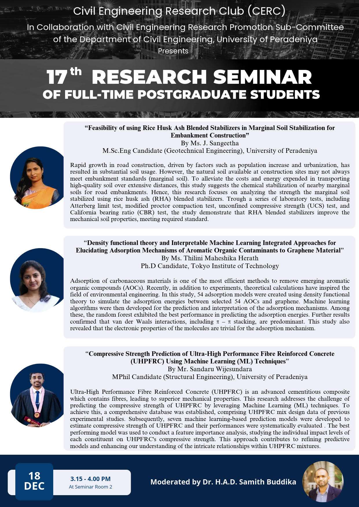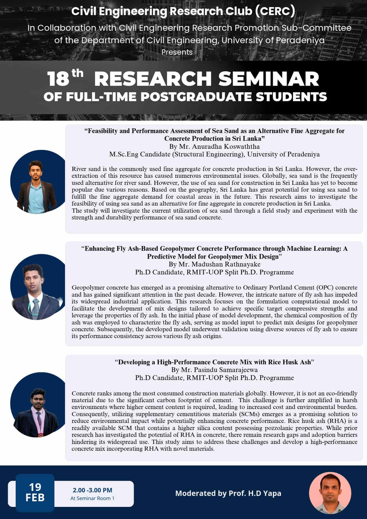 21st Research Seminar of Full-Time Postgraduate Students organized by Civil Engineering Research Club (CERC) in Collaboration with Civil Engineering Research Promotion Sub-Committee of the Department of Civil Engineering, University of Peradeniya was held on 02nd September 2024, from 2.00 p.m. to 3.00 …
