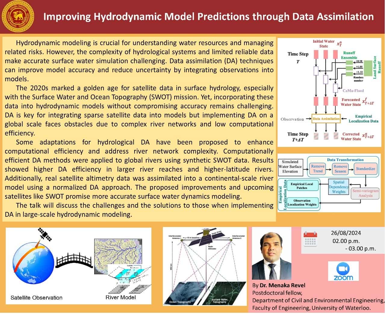 DEPARTMENTAL RESEARCH SEMINAR A Research Seminar (ONLINE) on “Improving Hydrodynamic Model Predictions through Data Assimilation” by Dr. Menaka Revel (Postdoctoral fellow, Department of Civil and Environmental Engineering, Faculty of Engineering, University of Waterloo) Research promotion subcommittee, Department of Civil Engineering …