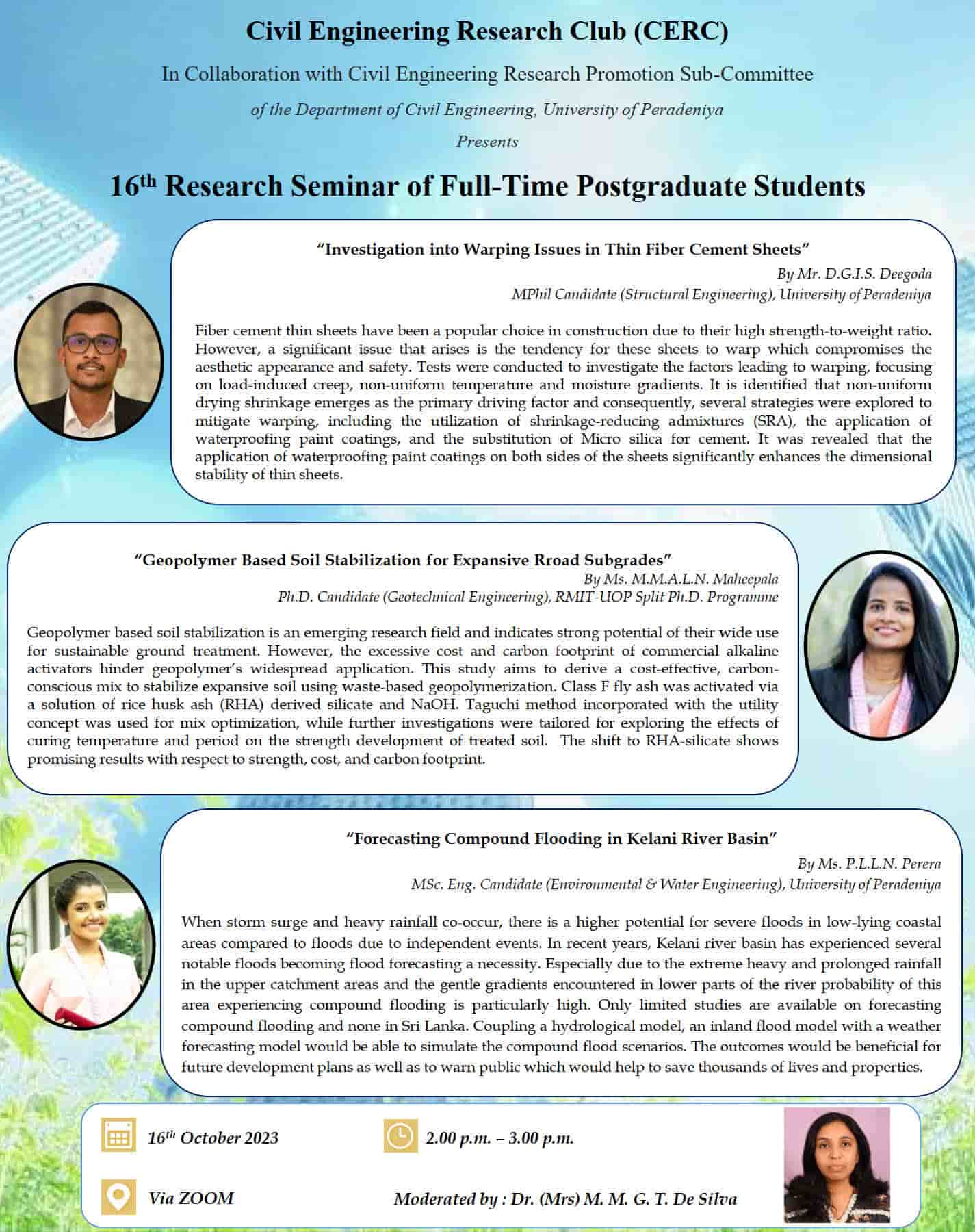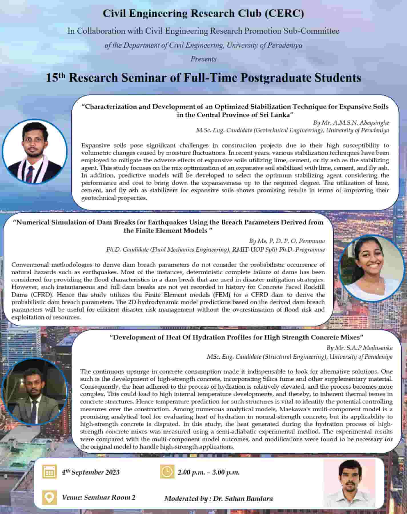 The departmental level evaluations of the final year (E17) research project proposals were carried out on 27th June 2023 in the Department of Civil Engineering. The evaluations of 74 research proposals were conducted in several different venues by eight panels, each …