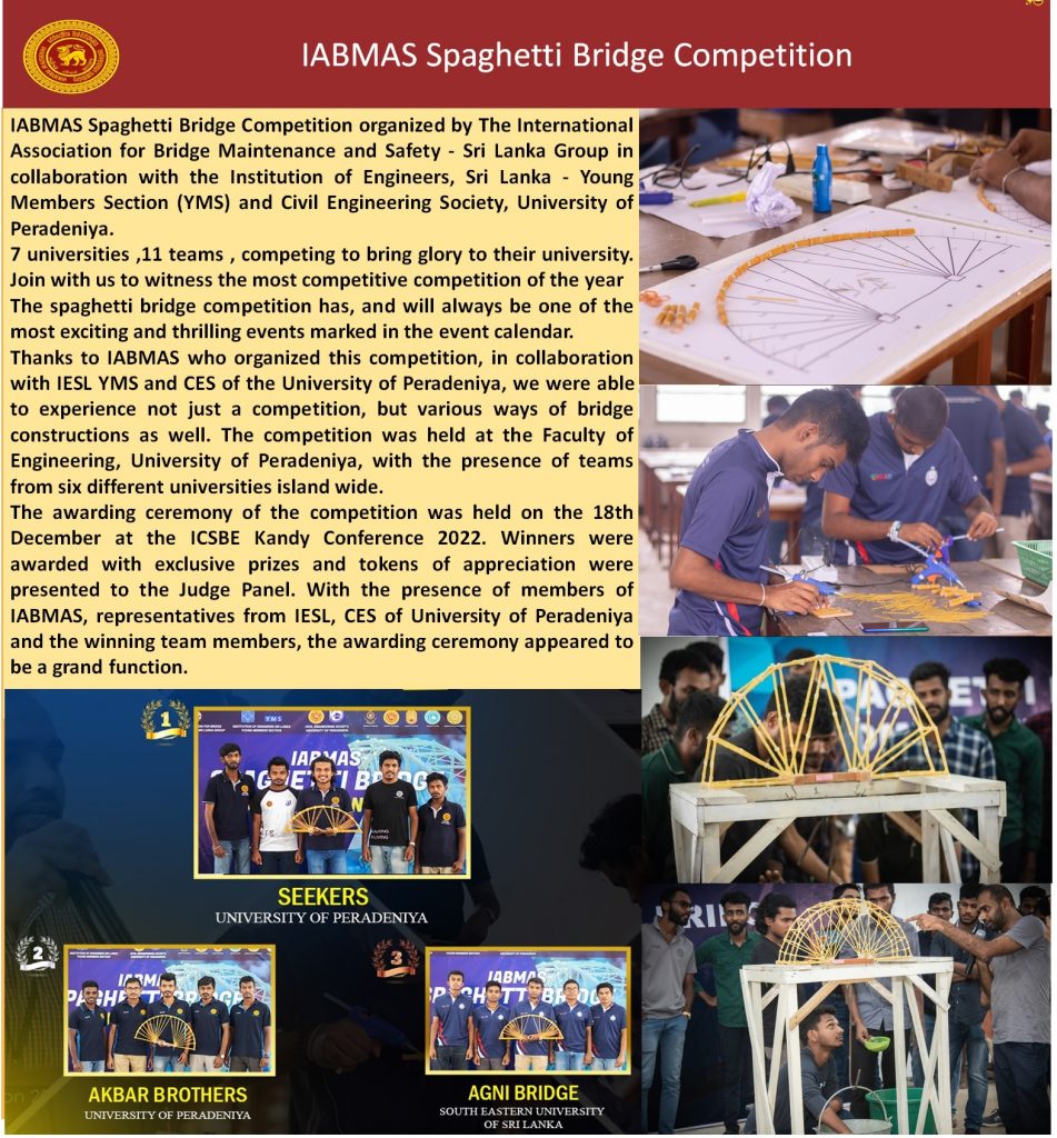 IABMAS Spaghetti Bridge Competition organized by The International Association for Bridge Maintenance and Safety – Sri Lanka Group in collaboration with the Institution of Engineers, Sri Lanka – Young Members Section (YMS) and Civil Engineering Society, University of Peradeniya.7 universities ,11 teams , competing to bring glory to their university. Join with us to witness the most competitive competition of the year The spaghetti bridge competition has, and will always be one of the most exciting and thrilling events marked in the event calendar.