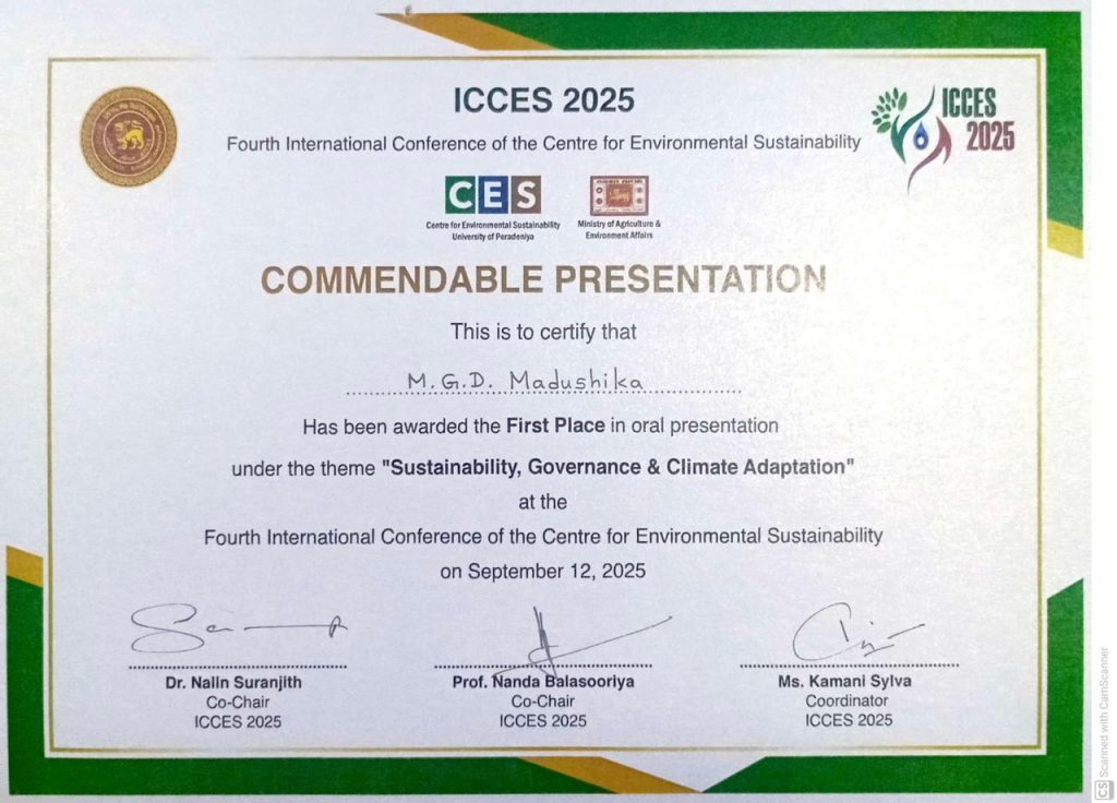 International Conference of the Centre for Environmental Sustainability Categories Awards, News Date September 12, 2025 Share: AutherDCE Previous post Eng. (Prof.) E.O.E. Pereira Memorial Oration 2025 September 12, 2025 Next post Paper Article by Dr. Jayalath Edirisinghe September 15, 2025 You may also like Promotion to the post of Professor – Dr. P. B. G. Dissanayake November 7, 2025 Department of Civil Engineering Participates in the Regional Climate Change Conference (RCCC 2025) October 13, 2025 University of Peradeniya Signs MoU with China State Construction Engineering Corporation (Sri Lanka) October 3, 2025