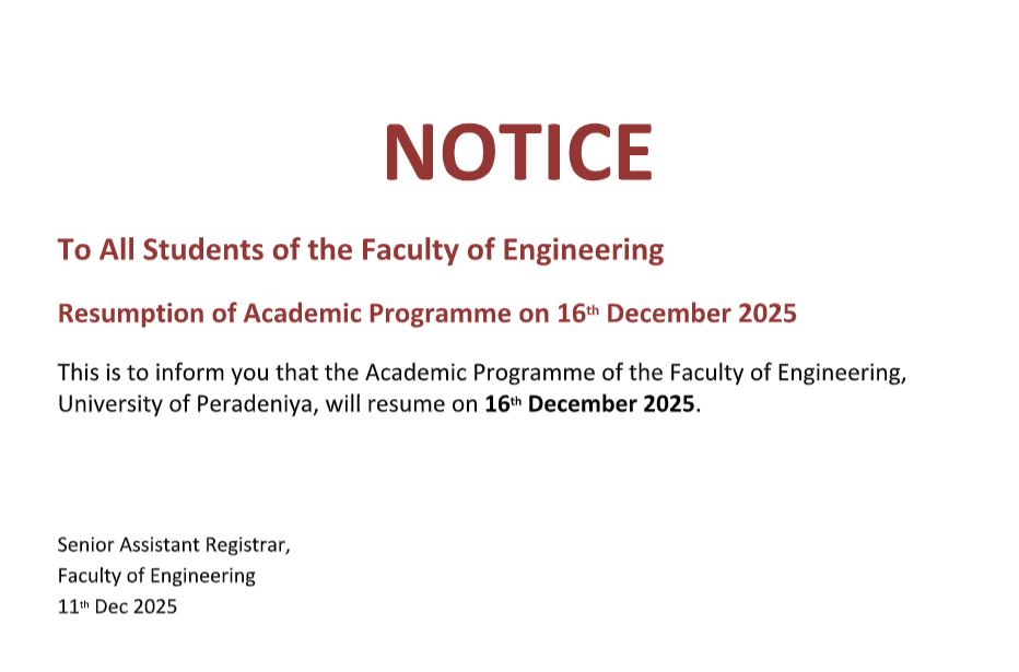Resumption of Academic Programme on 16 th December 2025 This is to inform you that the Academic Programme of the Faculty of Engineering, University of Peradeniya, will resume on 16th December 2025.